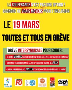 Les collègues ne peuvent pas tout tenir à bout de bras, en y laissant leur santé physique et mentale. L’inclusion sans moyen est une violence inacceptable pour les enfants, leurs familles et les personnels de l’Éducation Nationale. L’État doit assumer ses responsabilités pour que la loi votée en 2005 soit financée à hauteur des besoins qu’elle nécessite. L’intersyndicale prend ses responsabilités et appelle de façon unitaire à la grève et à la manifestation le 19 mars pour que de vrais moyens soient enfin débloqués pour permettre une inclusion qui ne soit plus synonyme de souffrance pour les personnels et pour les élèves.