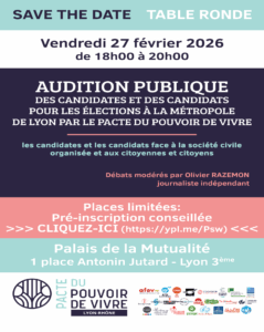 - Quoi ? Audition publique des candidates et des candidats pour les élections à la Métropole de Lyon par le Pacte du Pouvoir de Vivre, organisation représentant la société civile, dont fait partie la CFDT.